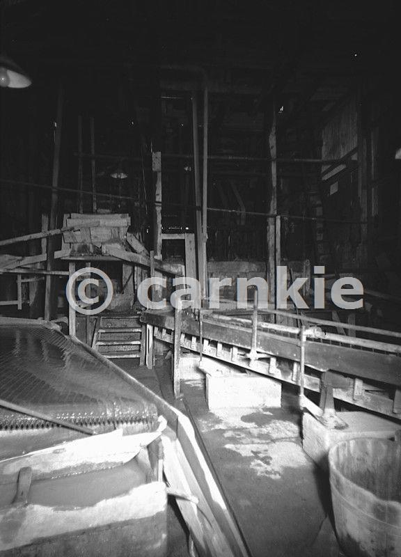 Castle an Dinas Wolfram Mine, the processing mill. General view showing jigs for the coarse material in the background, and tables for the finer material. The 'head' of wolfram concentrate, about 6 inches wide, shows dark just above the inclined pipe in the foreground: the middle product is seen passing off the right-hand corner of the table - for retreatment - and the waste material, from the side of the table passes down the launder on the right, to the waste dump. The Castle an Dinas wolfram lode was not known before 1915. In that year it was reported that alluvial deposits of wolfram were worked in the 18th and 19th centuries in the valley to the north of the hill. Exploration and a trial shaft in 1916 proved good values at 30 feet and development commenced. Photo P208062. Reproduced with the permission of the British Geological Survey ©NERC. All rights Reserved.
