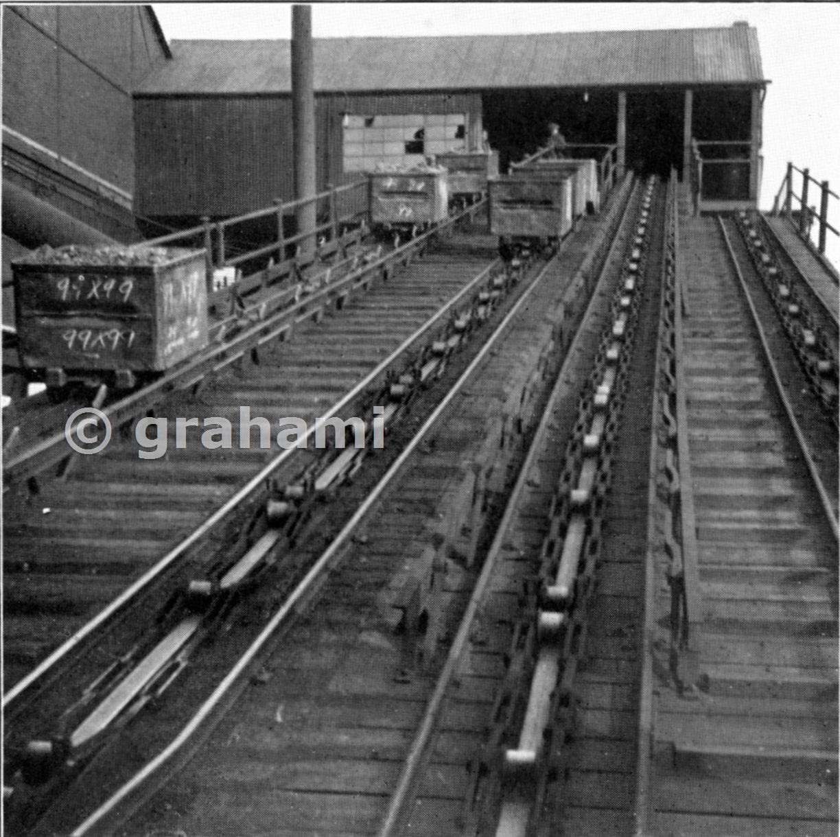 Caption: "After it is raised to the pit head the coal goes through various processes of classification and cleaning, according to its type. It is first sized by mechanical screening - similar to riddling - into large and small sizes, the larger coal being hand picked. The small, steam-raising coal is cleaned in a washery. The photograph shows pit tubs going up to the screening room."