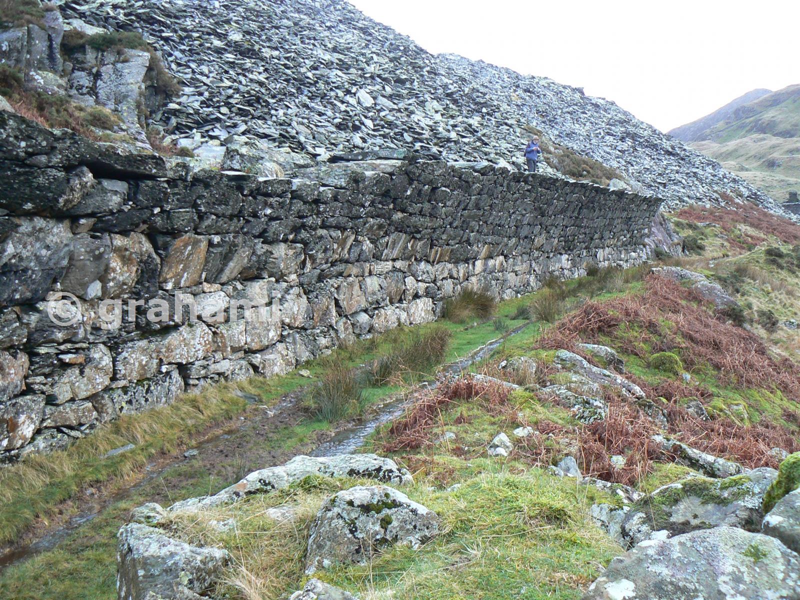 Various theories have been expounded - the most popular being that it is this shape because originally there as meant to be an "opposite" side to it to make a complete tunnel over the tramway, over which the slate waste could have been tipped - but it was never necessary.
