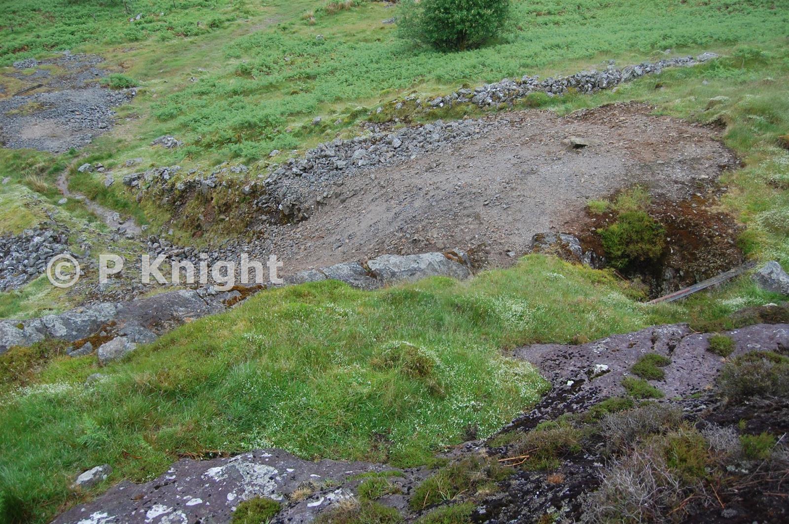 The winze and blocked level as seen from above. The tree to the rear marks the entrance to the lower level.