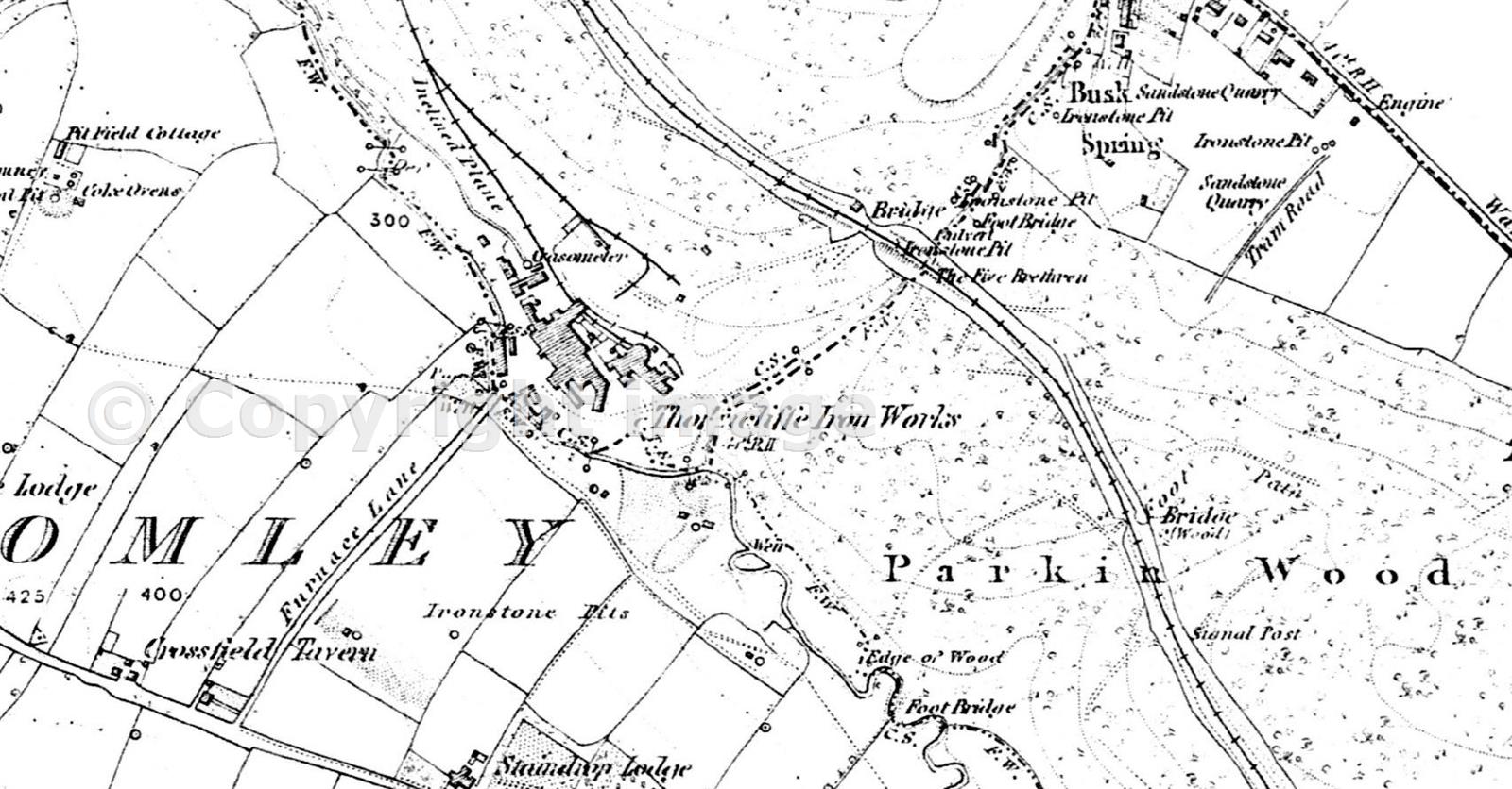 Ordnance Survey map extract showing Thorncliffe Iron Works. Staindrop Lodge and Parkin Wood provide links to features remaining in the modern landscape.
