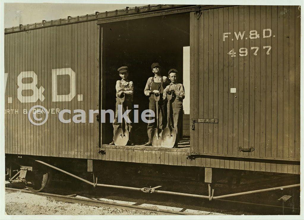 Three Boys Shoveling Zinc Ore from Car Into Wagon, Near Big Bonanza Mine, Aurora, Youngest boy is Robert Nichols, next larger is Hobart Crawford. They both go to school and work on Saturdays. The other boy works every day