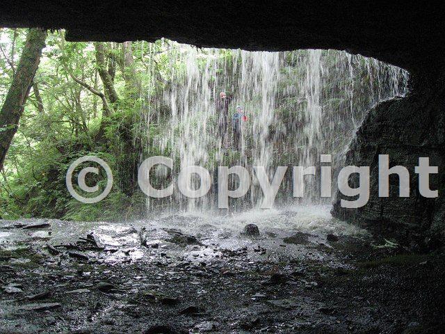 View from inside Blairskaith mine, looking out through the waterfall. Original file at: http://www.geograph.org.uk/more.php?id=3019527