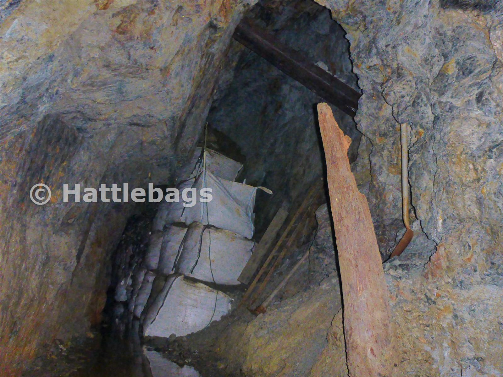 Looking up in to an old stope and showing the pack wall of filled dumpy bags.