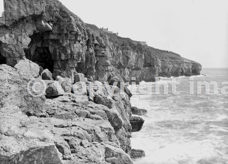 BGS Photo P201279 Reproduced with the permission of the British Geological Survey ©NERC. All rights Reserved. Description: Tilly Whim Quarries and Durlston Head from Tilly Whim. Looking NNE. Same as No. A1289, and showing part of the old quarry known as Tilly Whim. [Cliff of Portland Stone, with Lower Purbeck Beds forming a retreating brow.] Date taken: 12/10/1911 Photographer: Rhodes, J.