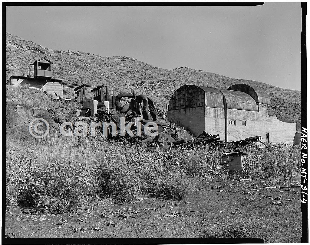 GENERAL VIEW OF TIPPLE AREA WITH RUINS OF THE TIPPLE ON THE LEFT AND THE BOILER HOUSING ON THE RIGHT (VIEW TO THE NORTH). Courtesy Library of Congress, Prints & Photographs Division, HAER, Reproduction number HAER MONT,5-RELO.V,1-4