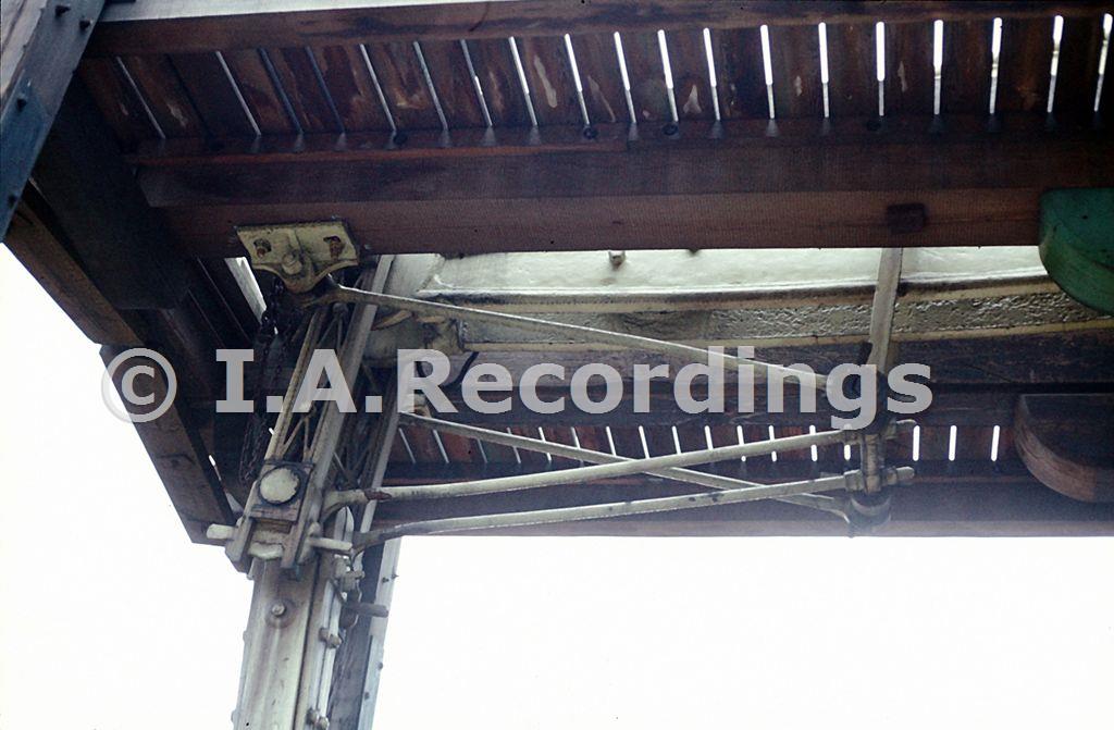 Detail of the outdoor end of the beam (under the bob platform) on the Elsecar Newcomen Pumping Engine, 6th May 1984. (Scanned from a damaged slide, image restored as much as possible in Photoshop).