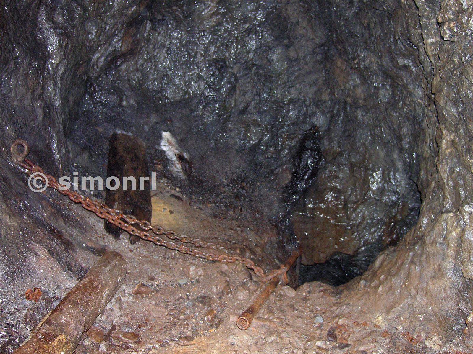 At the top of the second ladder, any attempt to photograph the higher level failed due to a combination of flash and airborne water droplets, Benallt copper mine, Nantlle valley.