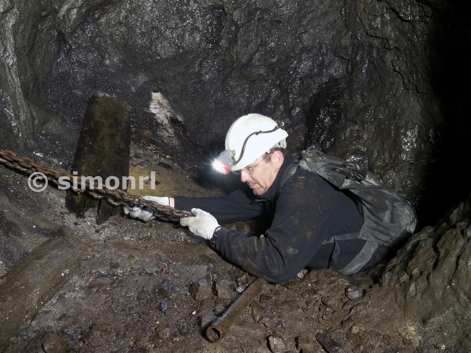Topping the second ladder from deep adit level Benallt Copper Mine July 2014