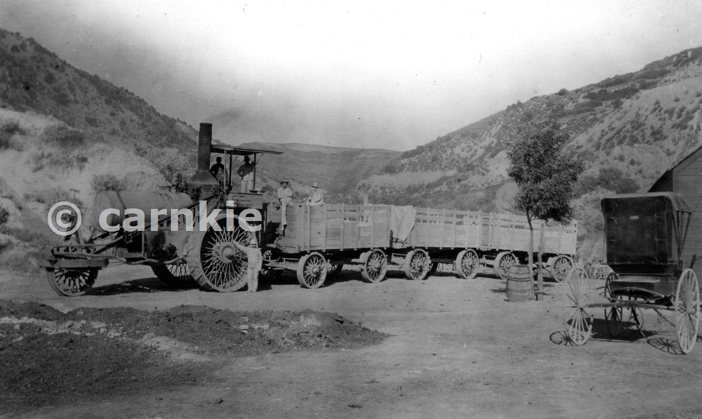 Traction engine and three wagons by which plaster is hauled 5 miles from gypsum mill of Utah Consolidated Plaster Co. to railroad. Courtesy U.S. Geological Survey. http://www.usgs.gov