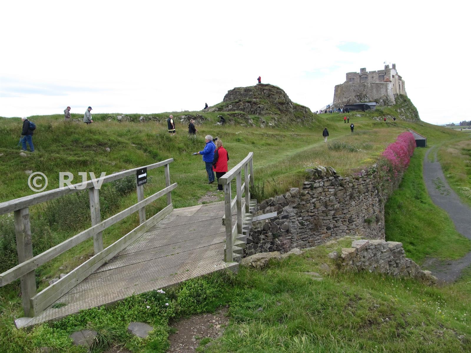 Modern footbridge utilising the old tramway abutments. The tramway crossed the bridge from the Ness End quarries to the reversal back to the left to the top of the kilns. The tramway from the kiln bottoms passes under the bridge and contours around the back of the castle to the new jetty.