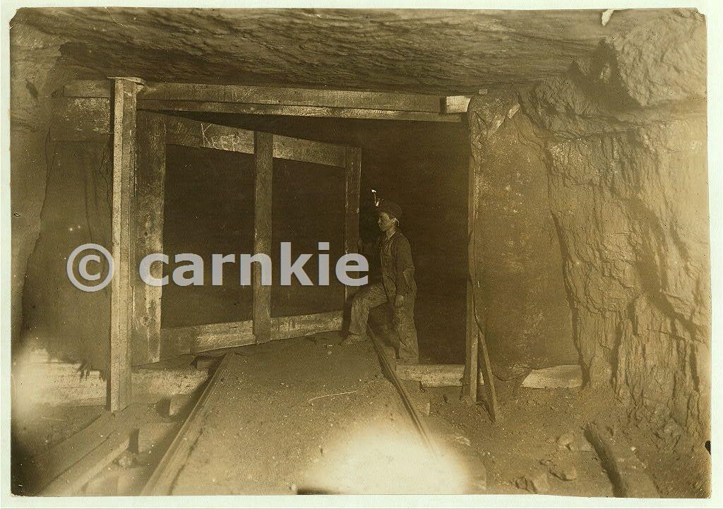 Trapper Boy, "Son." Opens and closes door that controls ventilation. He is underground from 7 A.M. to 5:30 P.M. (Much of the work of mining, loading and carrying is done by machinery.) Boy has been trapping for several years. Asked if these boys did this one thing all the time, the boss said, "Oh, they change around from one door or another."