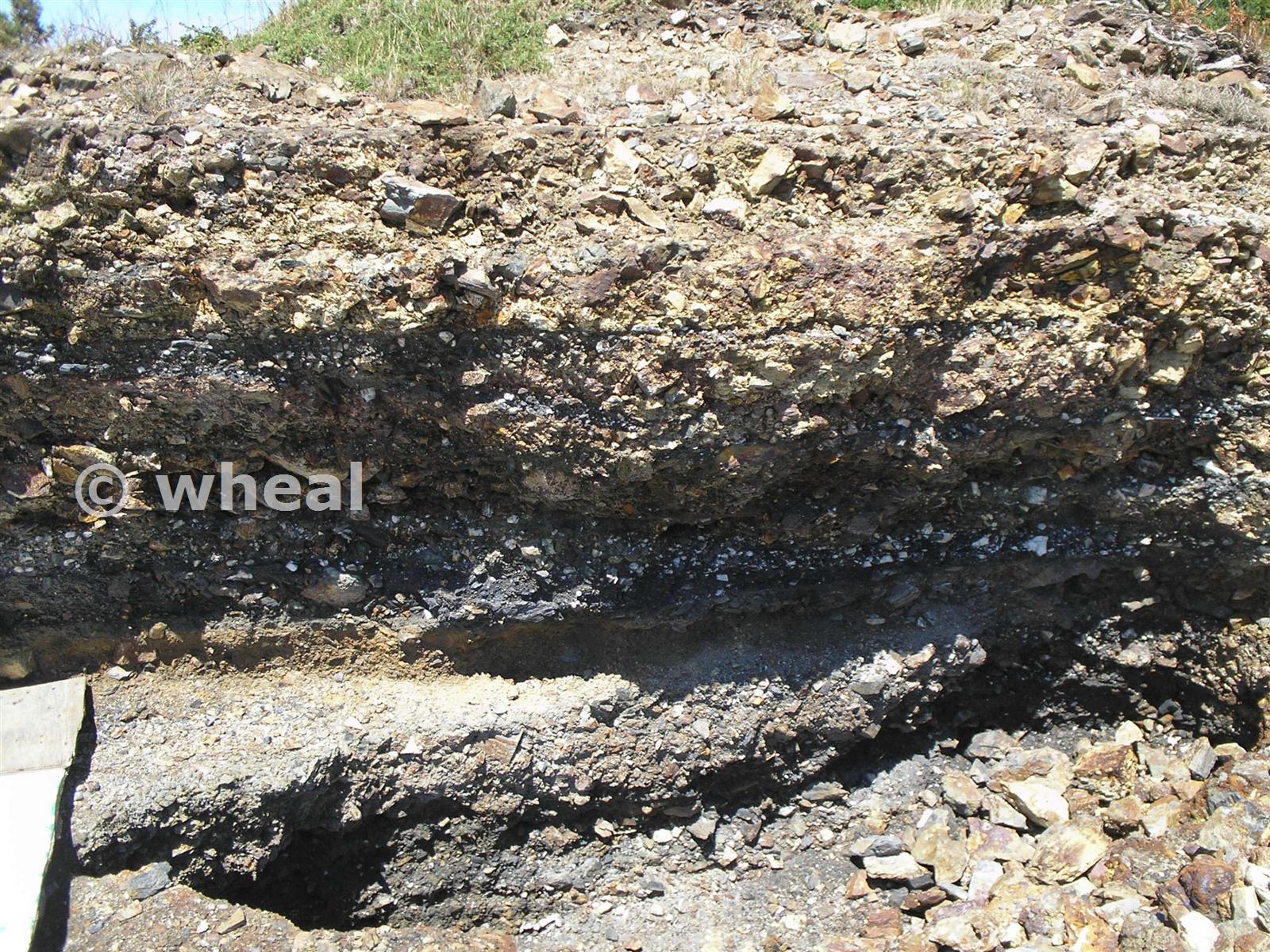 A cross section of the burrow showing the mineralised waste material. Flat Rod shaft is according to Dines to the 50 fathom level.