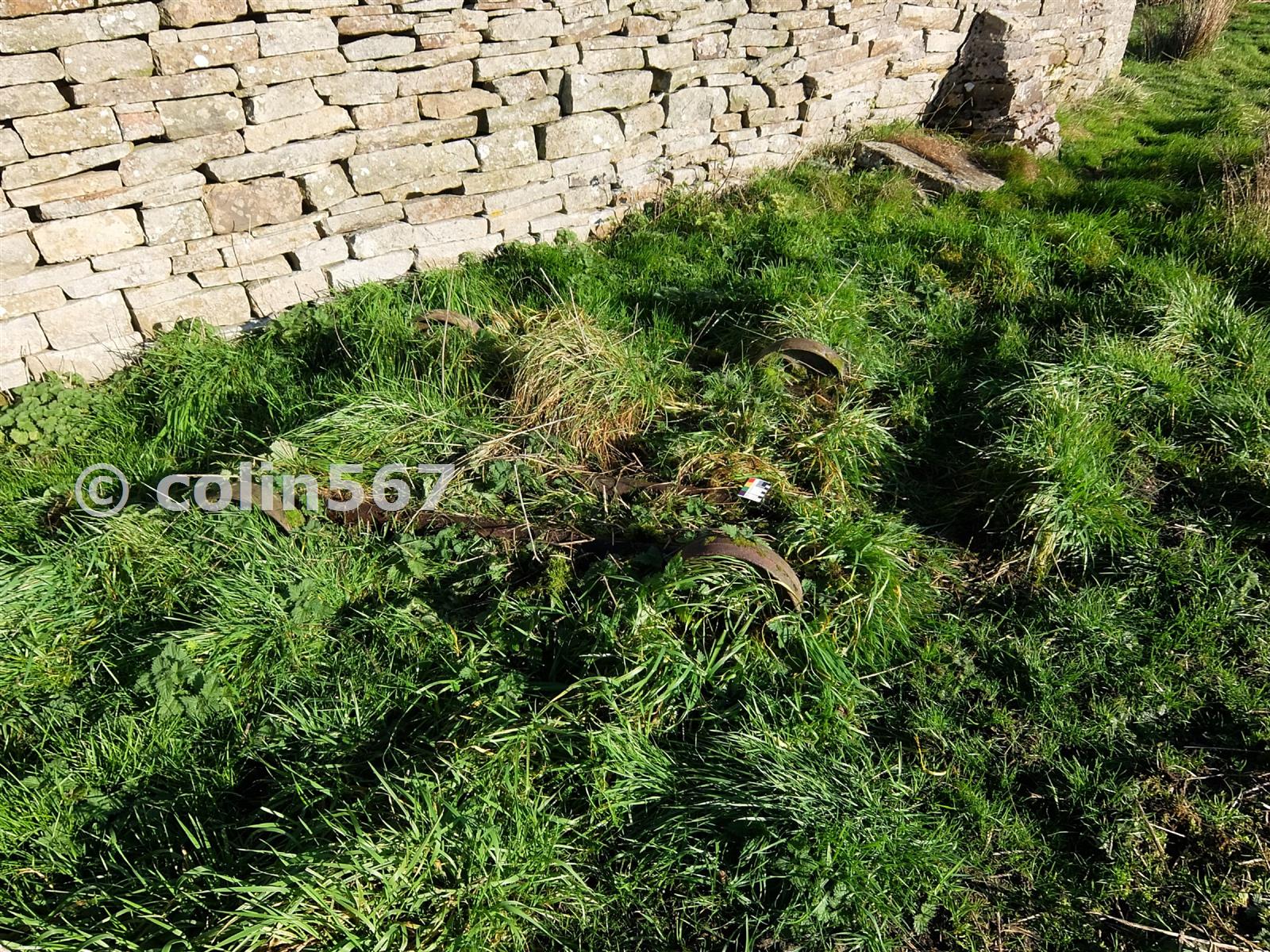 4 wheeled iron trolley, well overgrown with grass and moss. Could have been part of the Brickworks?