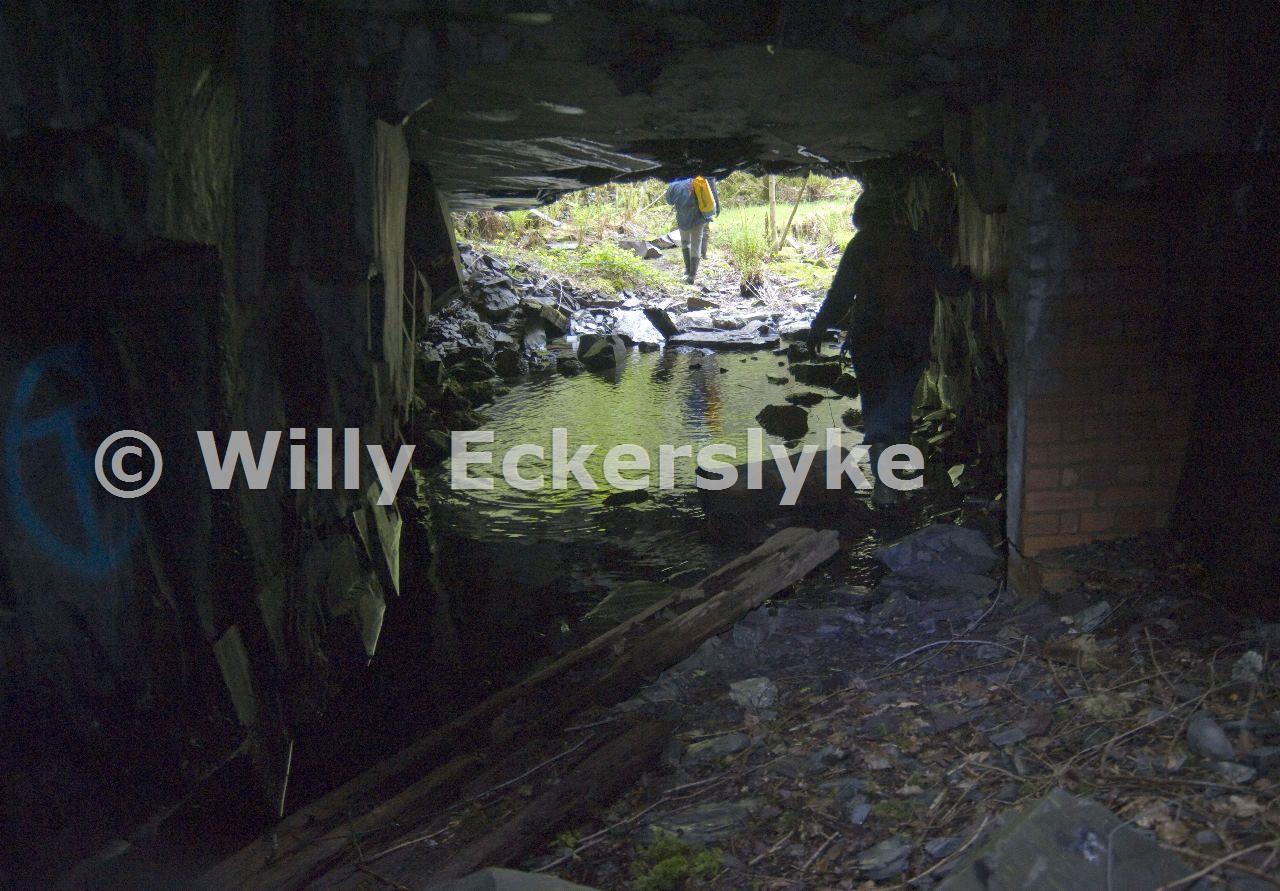 Tramway leading out of tunnel from bomb store into bottom of small pit before heading onwards.