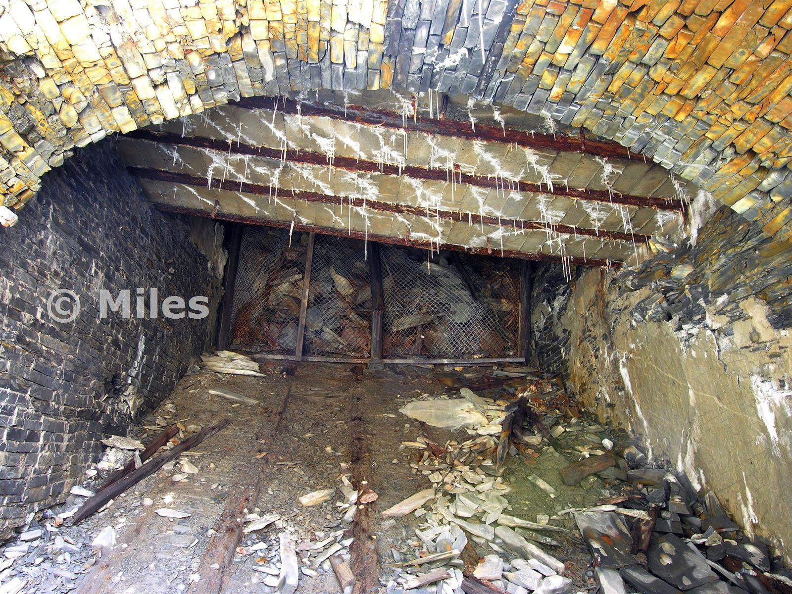 Recent untopping work has uncovered this section of the Tuxford incline. The Tuxford ran from high on the mountainside to floor C within the mine. The bottom of the incline ran in an arched tunnel to protect the incline from falls from the poor rock above.