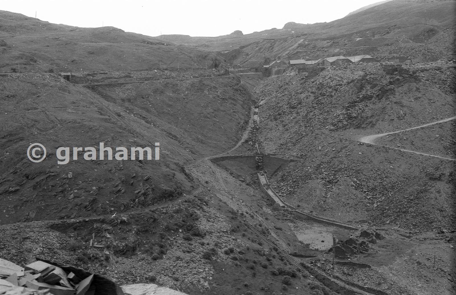 Taken from the Maenofferen tip, with the main mills beyond. Looking down at the Votty culvert (dry) - actually the diverted and channelled Afon Bowydd. At the bottom are the ruins of the Maenofferen cottages. In the centre is the route of the Tuxford tip tramway carried over the culvert after which it tunnelled under the Rhiwbach No. 2 Incline. The route to the right has been buried in this shot by the new road to the mills.