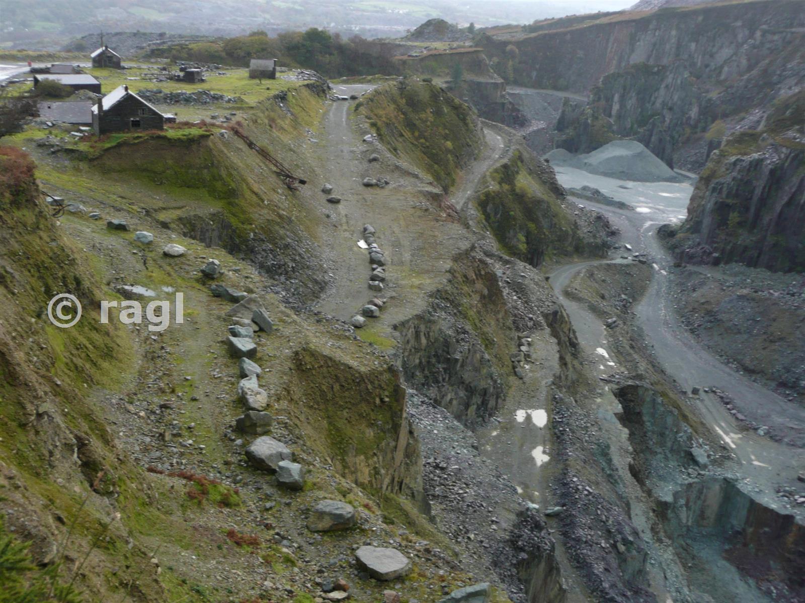 Twll Eureka now joined up with Twll Ellen, with access road into pit. Note the felled Blondin tower for Cable-N over lip of the pit top centre.