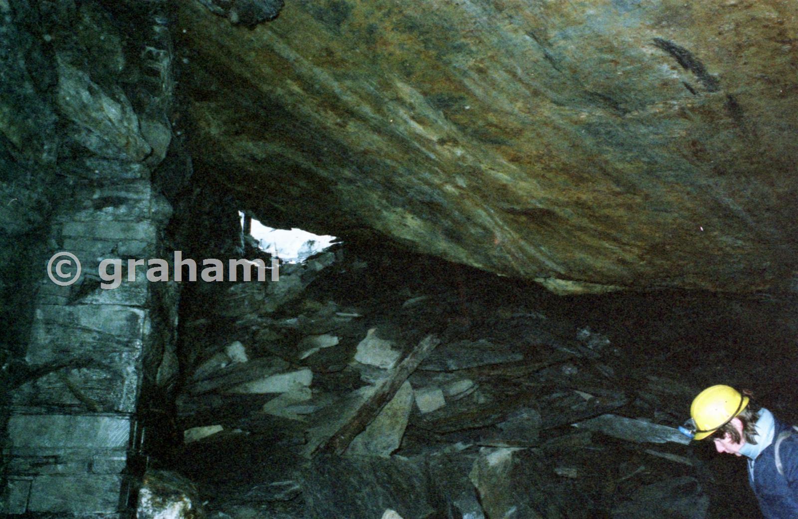Here we are under the "10,000 ton boulder" just above G floor, looking up towards the drumhouse high above. The HIK incline bed itself is buried with rubbish.