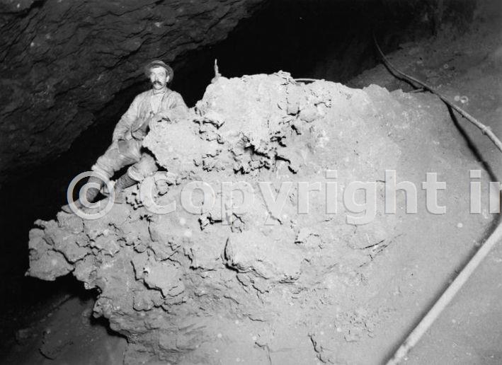 UNDERGROUND VIEW OF MINER PERCHED ON MASS COPPER. NOTE THE CANDLE AND COMPRESSED-AIR LINE. C. 1890. - Quincy Mining Company, Hancock, Houghton County, MI