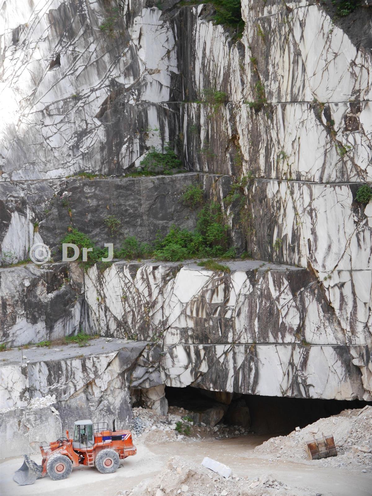 Entrance to below ground quarrying works, at lower site within Fantiscritti valley. Excavator for scale