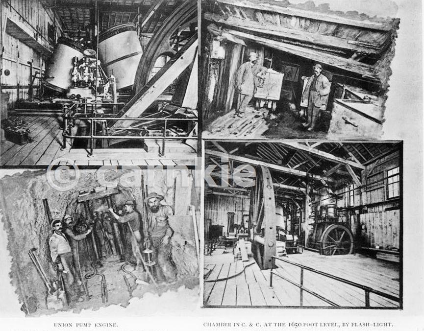 Union pump engine. Burleigh drills at work, made by flashlight. Chamber in C. & C. at the 1650 foot level, by flash-light. Interior Union works-draft wheel wheighing (sic) 110 tons. LoC REPRODUCTION NUMBER: LC-USZ62-107522