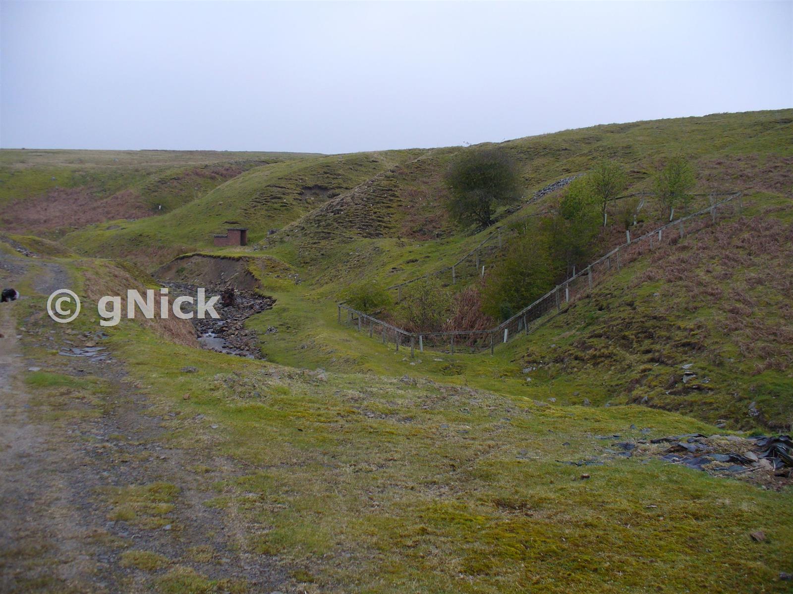Looking up the tramway route towards the second level which is to the right of the brick building. Directly below the building in the burn is the remains of a car and more importantly the fenced area on the right is a shaft that is covered with timber, shaft 2
