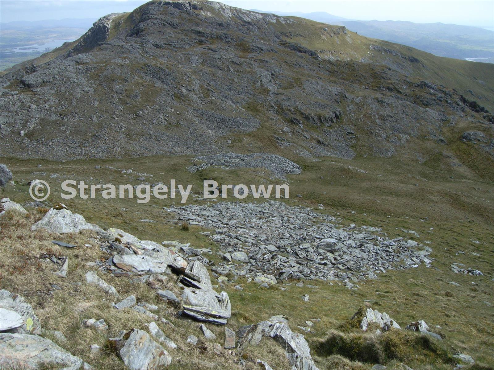 This loose rock seems to be mine debris as it's different to the surrounding scree and has no obvious source. Could this be where the roof shaft marked on the 1980s survey meets the surface?