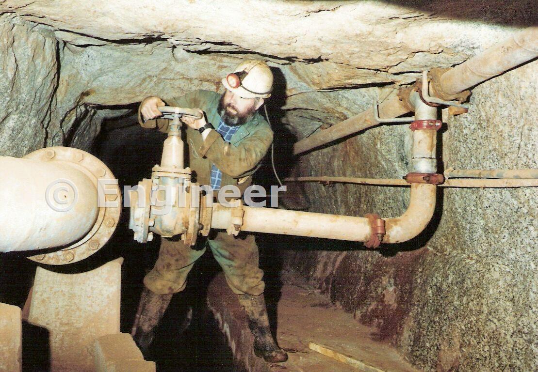 Bob Orchard opening valve to drain pig lode sump water to bottom of incline via the disused compressed air pipes (So that the water would not be seen while underground tours were still taking place). The mine took almost 3 years to the day to fill to adit level.