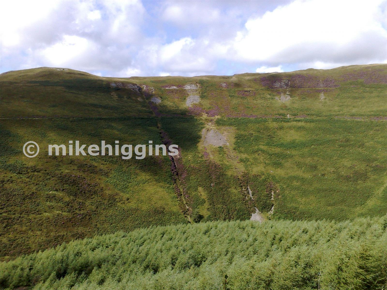 This view from the opposite side of the valley shows the hush, the two leats and the spoil below the run-in Llettymarallt adit
