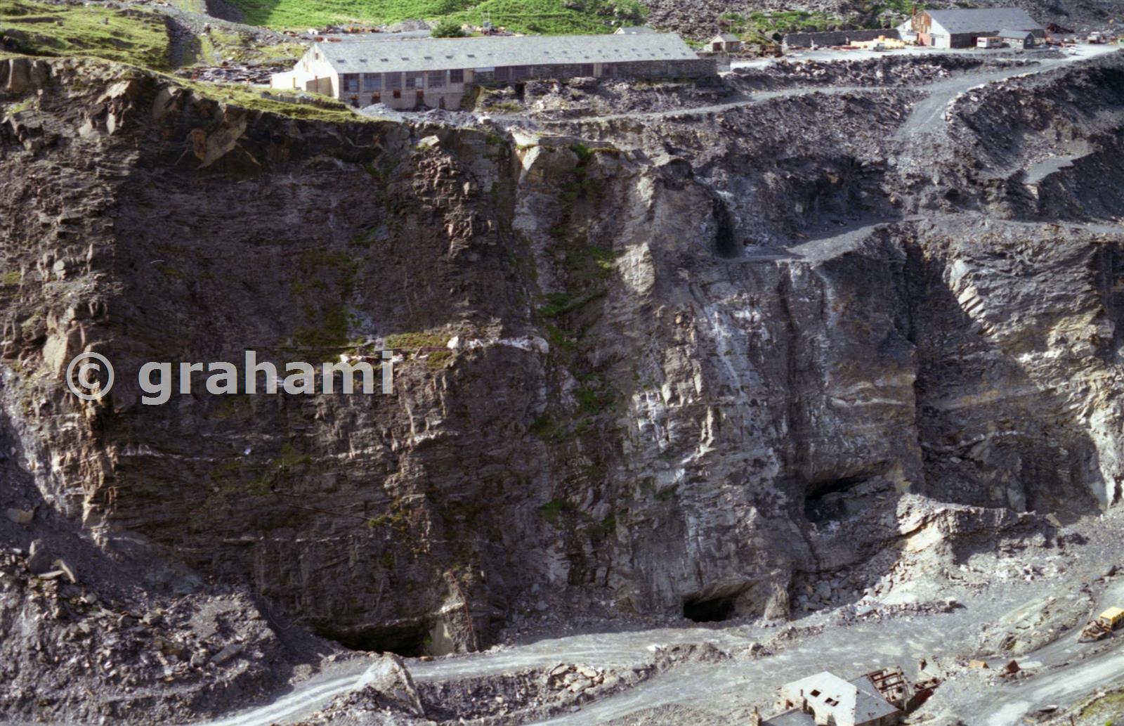 This view shows the HIK buildings at bottom, the leftmost opening is the old K Trwnc building, then the old stairs chamber. The quarry floor was about halfway between F and G at this time. The building at the top is Old Bonc Siafft Mill, with the vertical balance shaft behind it. You can just see the top of the tree which grew literally at the top of the shaft. The other half-dismantled building is the New Bonc Siafft Mill. Both have gone now, quarried away. In 2000 I saw the vertical shaft exposed for half its depth by the quarrying operations.