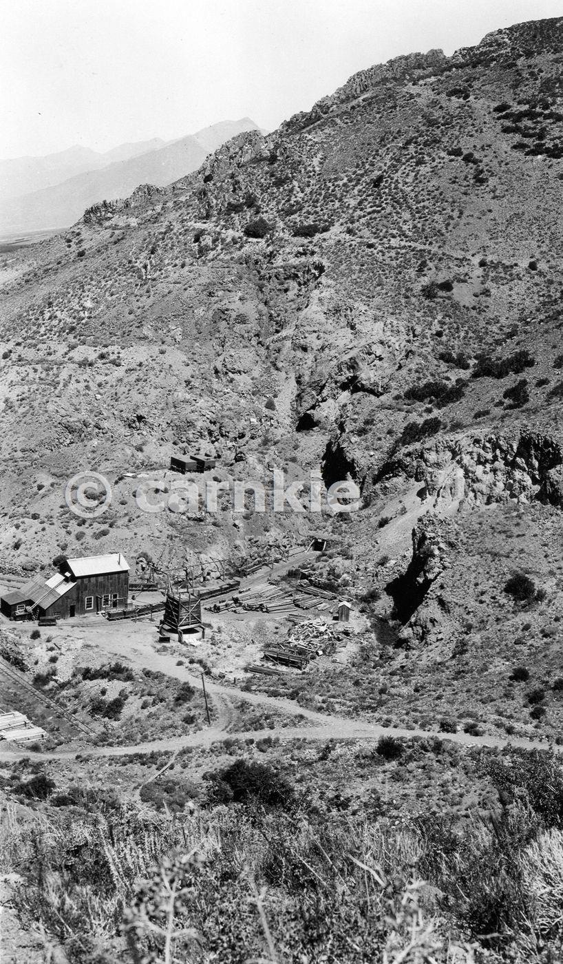 View north 30 degrees west along mine openings on fissure in ore- bearing limestone. The tramway runs into the portal on No. 5 level. Orient mine, Saguache County, Colorado. July 30, 1926. Courtesy U.S. Geological Survey. http://www.usgs.gov
