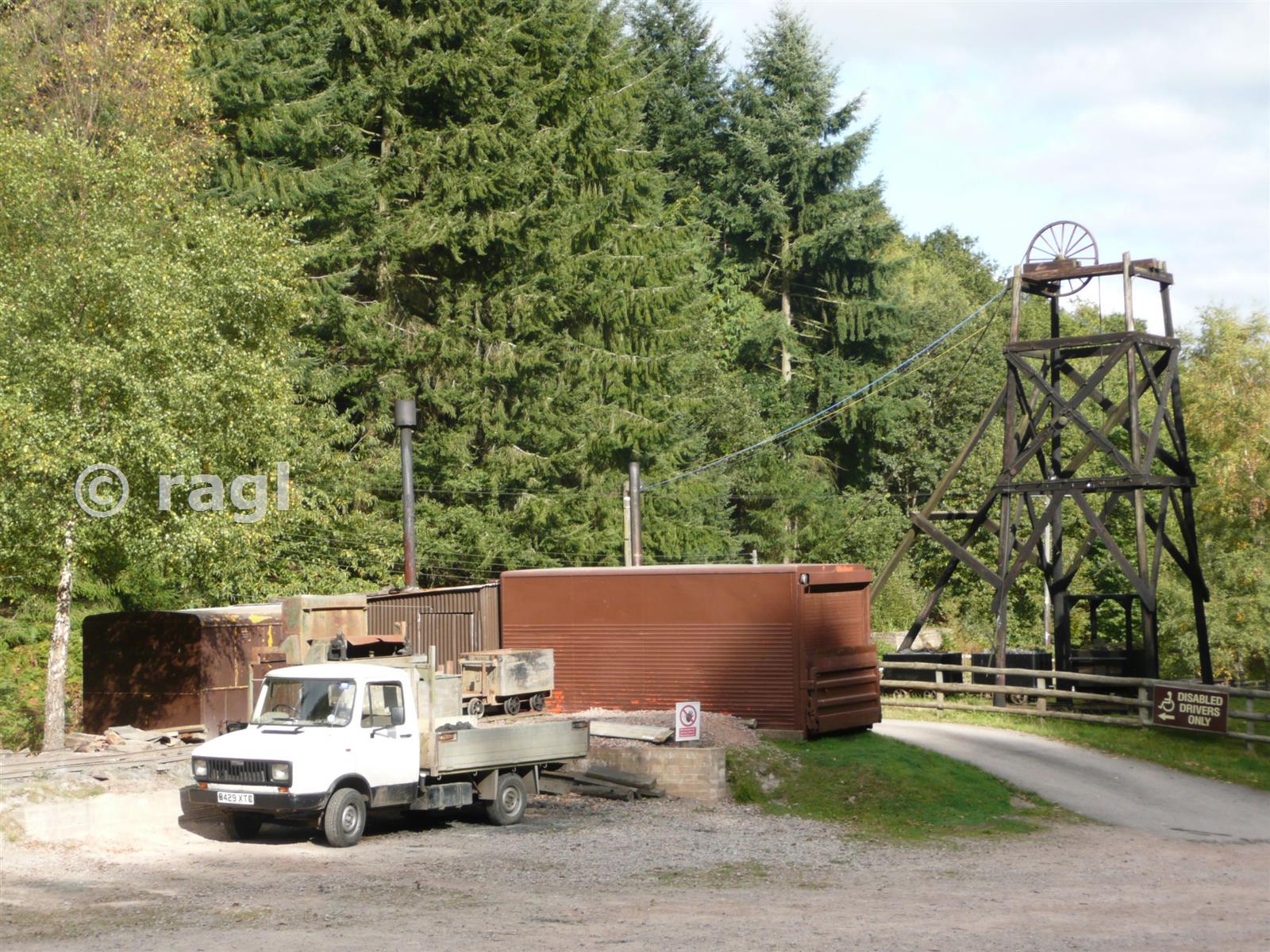 Tub tippler is behind pick-up truck. Winch for incline into drift is in the red building behind truck. Headgear is a replica for the adjacent mining museum.