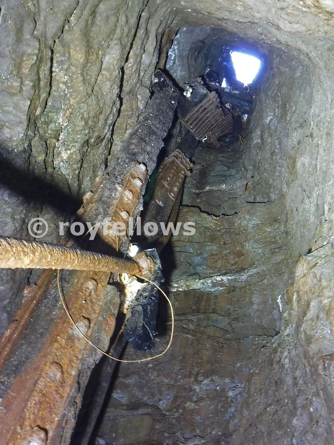 This is a hand held camera shot taken with about 35500 lumens (that''s thirty five thousand) of light up the shaft. What can be seen here is a section of pump rod and possibly a balance bob rocker beam and a section of wrought iron support which would come off the King Post. I can remember a timber box in there originally, now buried. This was possibly a balance box. I believe that the ledge that can be seen corresponds with the 14 fathom level.