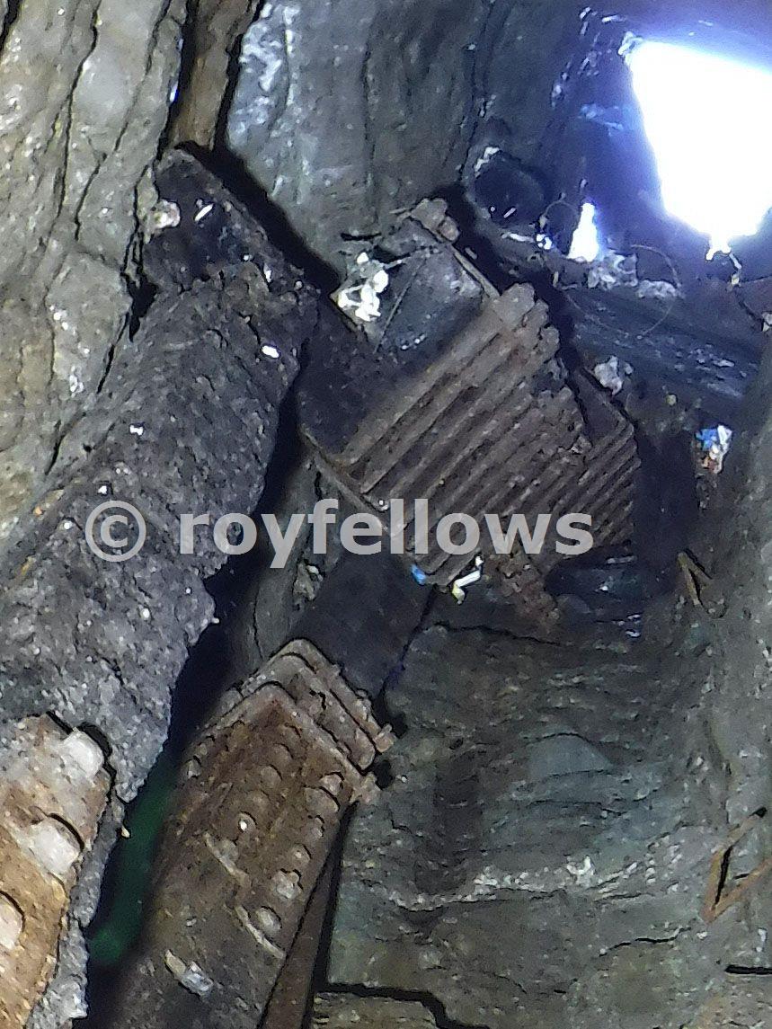 This was a digital zoom in of a hand held camera shot taken with about 35500 lumens (that''s thirty five thousand, not a typo) of light up the shaft. What can be seen is an upper section of pump rod with an offset and strapping plates which appears to be jammed into a rubbish filled level, possibly the 10 fathom.