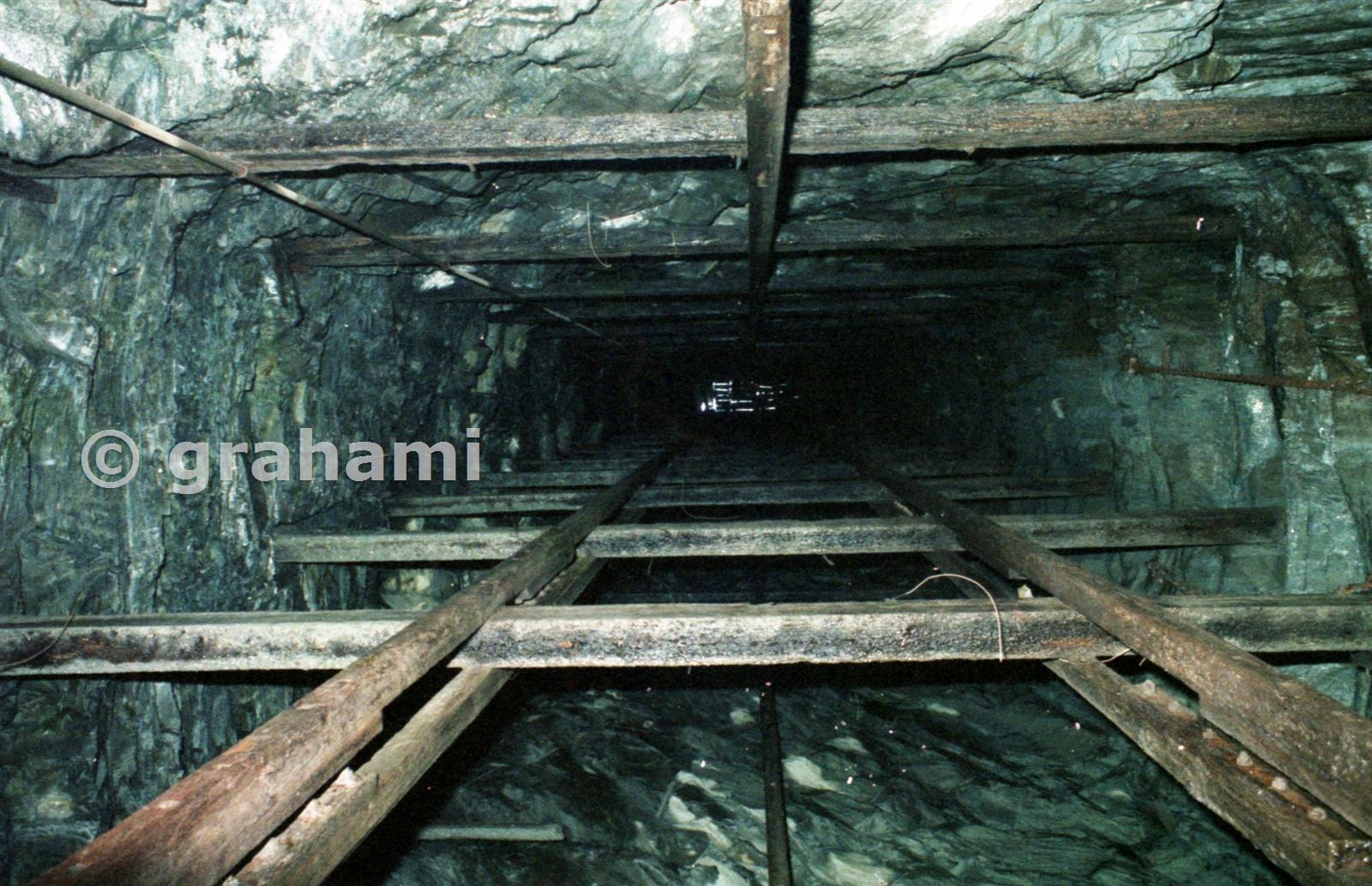 Here you can see the heavy timber framework that acted as cage guides - again almost identical to structures seen at Penrhyn. the shaft dated back to about 1854 and was in continuous use until 1923 when the cages were smashed and the headgear etc. twisted after an overfill of one of the tanks.