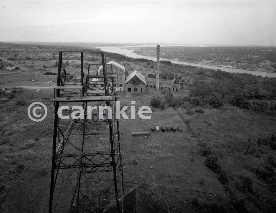 Jet Lowe, Photographer, July 1978. VIEW FROM TOP OF 1908 NO. 2 SHAFT-ROCKHOUSE LOOKING DOWN ON NO. 2 HOIST HOUSES AND NO. 5 BOILER HOUSE AND STACK Courtesy Library of Congress, Prints & Photographs Division, HAER, Reproduction number HAER MICH,31-HANC,1-54