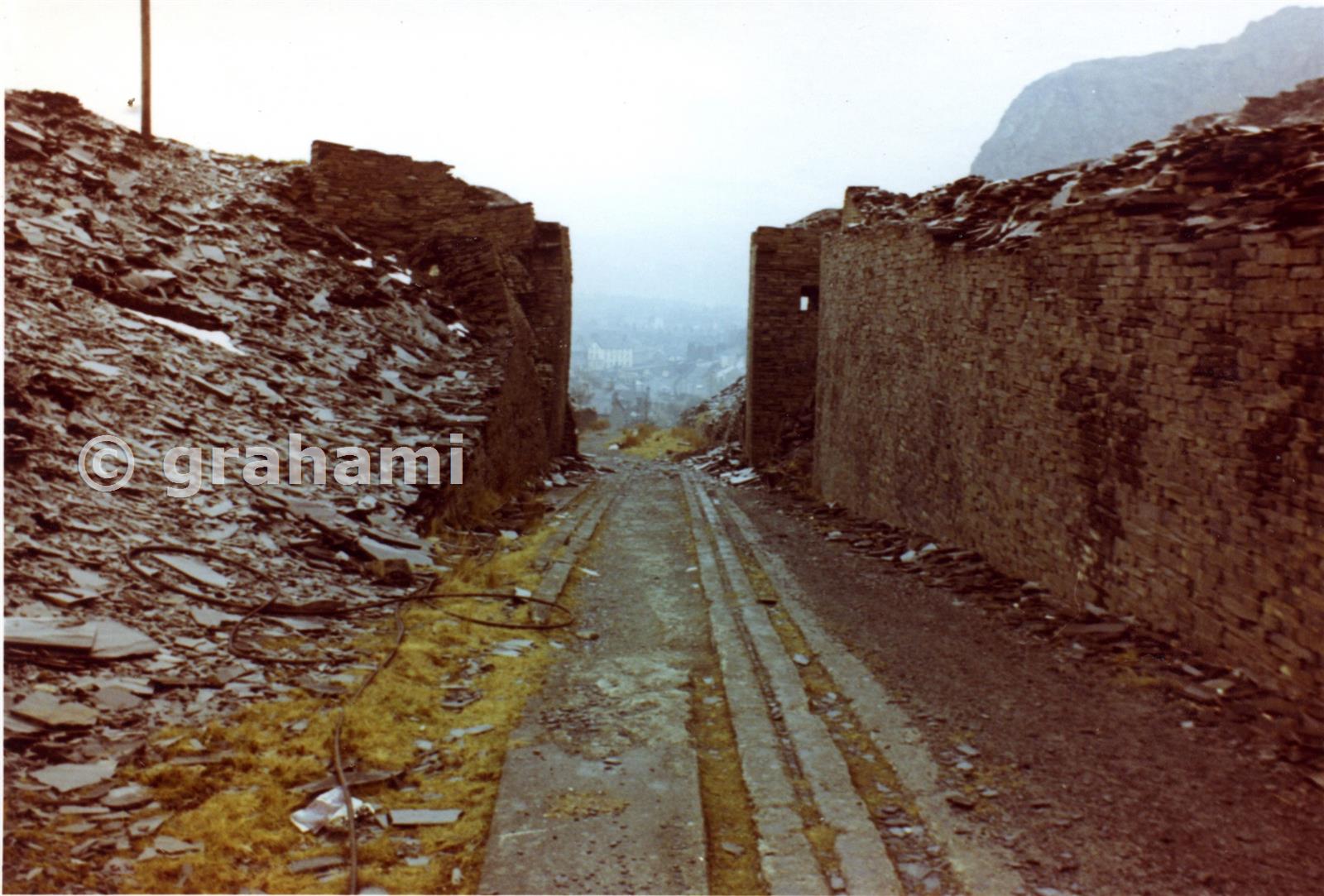 A closeup of the Votty C floor Waste overbridge over the Diffwys Incline at Easter 1975 looking down towards Lord Street and the FR terminus at Duffws.