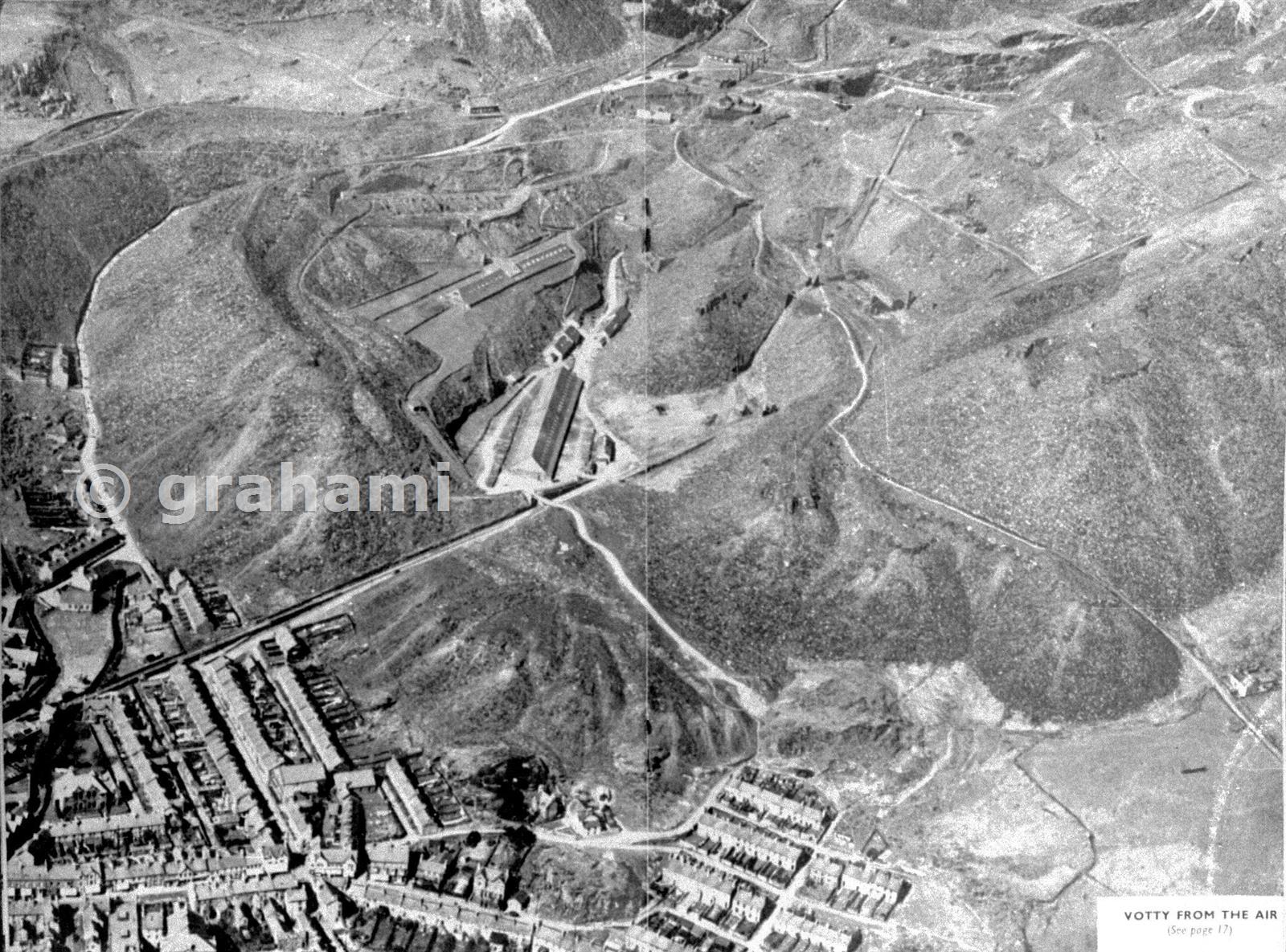 An aerial photograph from the "Caban" collection. Here is Votty pre-closure: The C mill with above it the small diamond saw mill; above them both the B mill. Above that the A mill is a ruin - but hiding the secret of the Mathews dressing machine for future IA explorers to find.