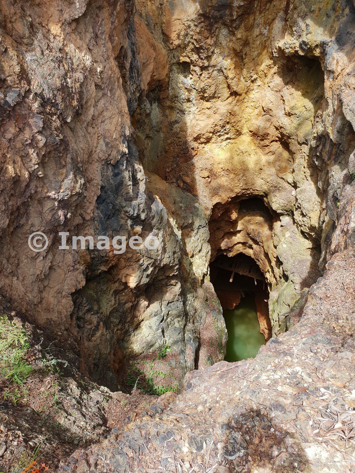 Peering down into the open-cut, water about 20-25m down and some wooden staging is visible.