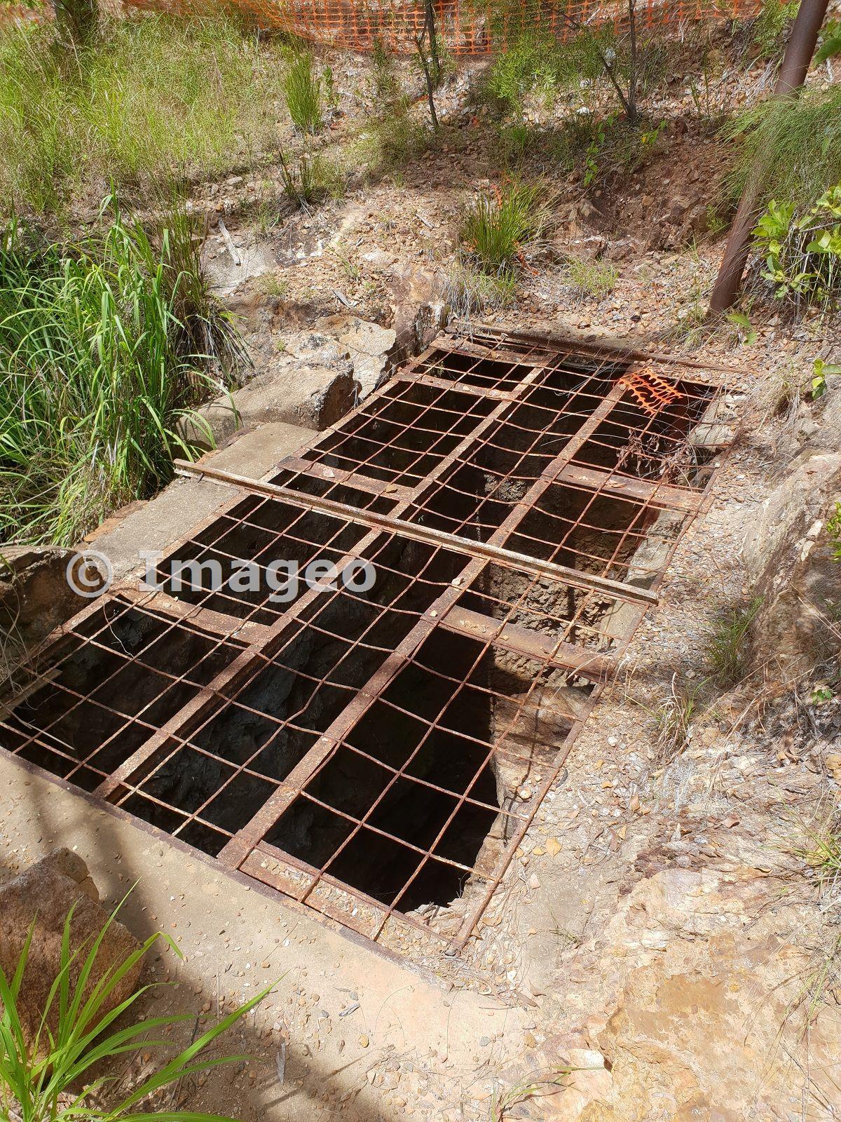 The mesh cover over the shaft. Rising main pipe adjacent to back right corner.