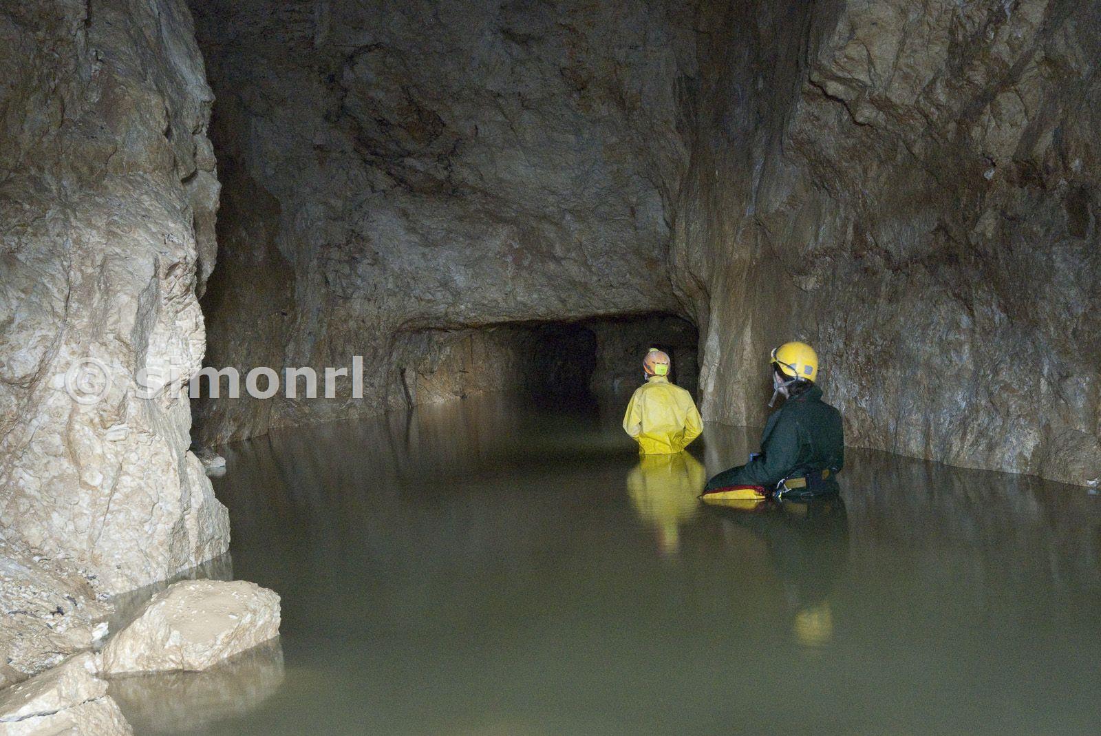 Rockchick and Tom wading through the recently dewatered lowest (currently - who knows what will appear...) level at Hendre. Hendre Spar Mine October 2011