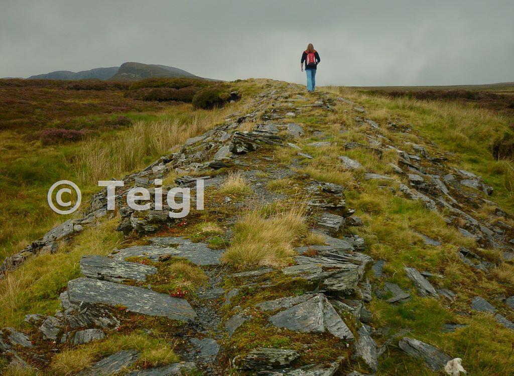 A tramway running along the top of a tip/causeway from the pit to the "mill" at the waterfall.