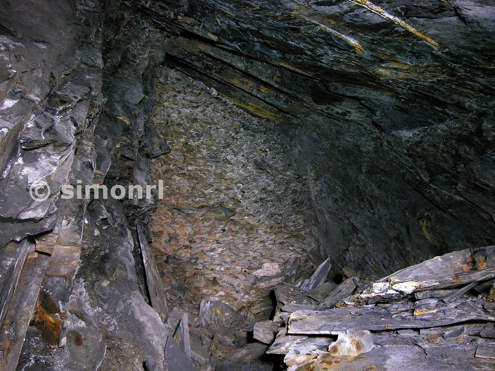An impressive slate wall holding back backfill. Cwmorthin back vein floor D, chamber 6E.