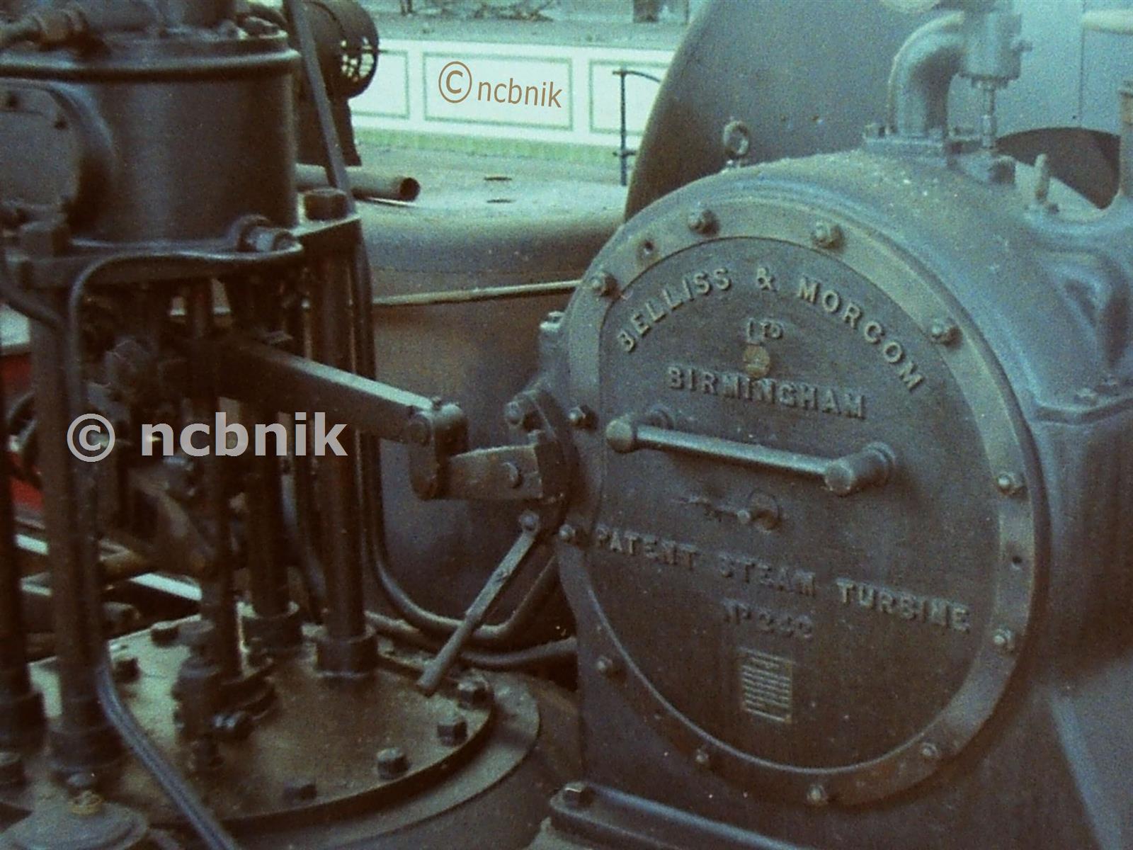 Walton power plant No.1 Turbo-Alternator - turbine end. The stop valve mech is the assembly to the left. If you look carefully at the top of the photo just to the left of the ''copyright'' notice you can see a curved cage assembly which is the one clearly visible in Dickie Bird''s adjacent photo which shows No.2 Turbo-Alternator; this cage is the exciter dynamo cover. The turbines of both sets were, in essence identical although installed around 17 years apart; the alternators attached were different however. No.1 was an English Electric 1875 kVA alternator, No.2 a Lancashire Dynamo & Crypto 2500 kVA. Both were 3,000 rpm 2pole/phase types
