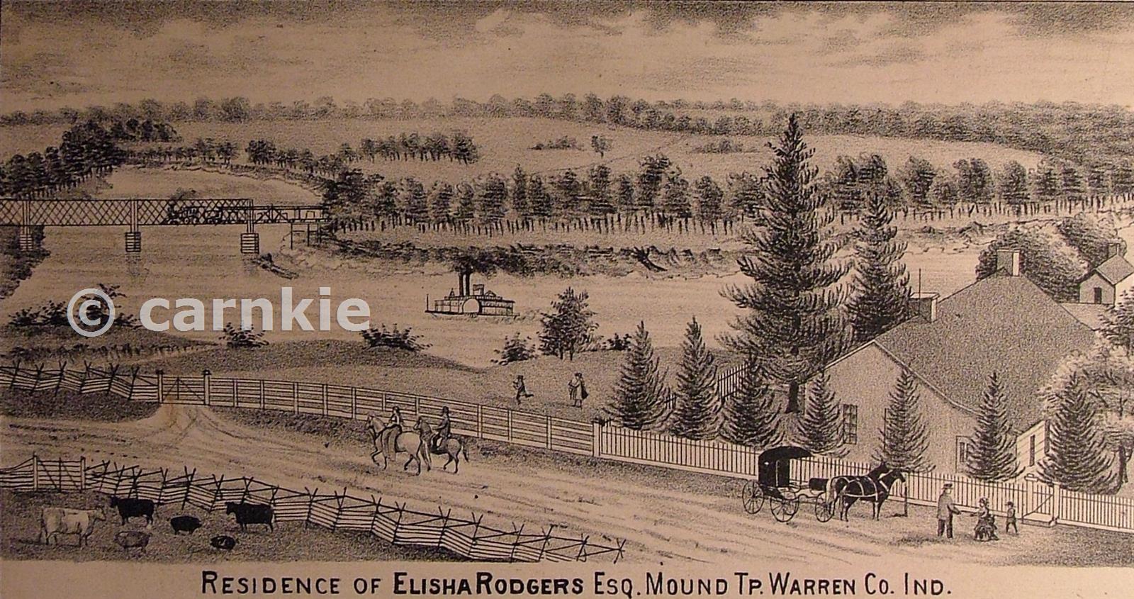 Drawing from the 1877 Warren County Atlas, looking northeast from Baltimore across the Wabash River, with the Pumpkin Vine bridge in the background