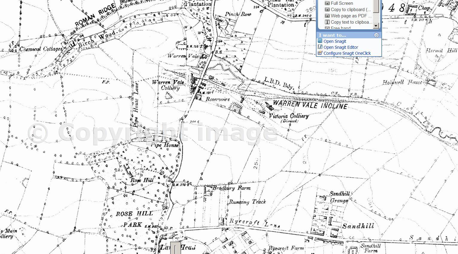 Warren Vale and Victoria Collieries shown and the Warren Vale incline tramway to the canal near Kilnhurst Colliery.