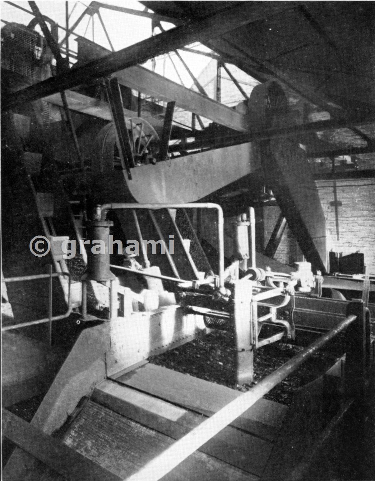 Caption: "Here small coal is being washed. After it has separated from the large coal it comes into a fast moving stream of water which sweeps it into the washboxes, one of which may be seen at the right of the picture. The water in the box is regularly pulsating , and the good coal rises to the top and is carried over the edge of the box and down the slope seen in the foreground. The heavier, waste, material sinks to the bottom of the box, where it is extracted and carried away by the bucket conveyors which can be seen rising on the left."