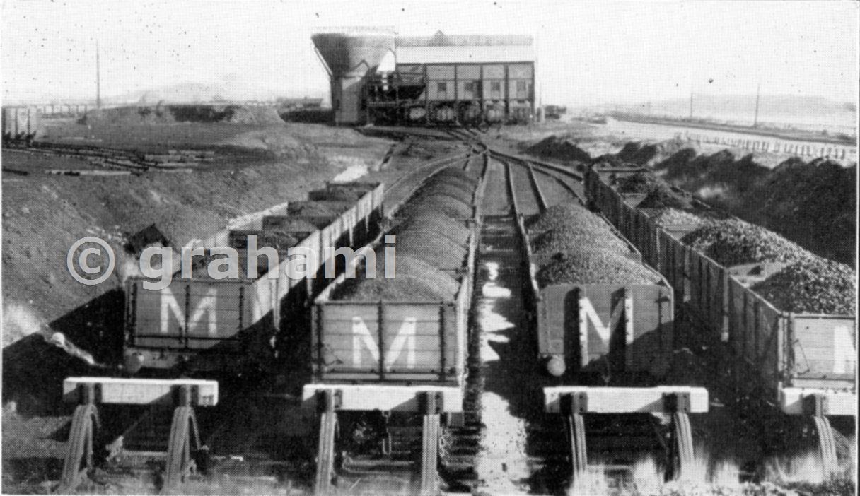 Caption: "The final stage; the wagons are being loaded at the washery, while others have been taken to the railway siding, where they stand for at least a day to drain off any remaining water before they are hauled away to be delivered to the colliery company's customer." N.B. The "M" on the wagons stands for "Manchester Collieries"