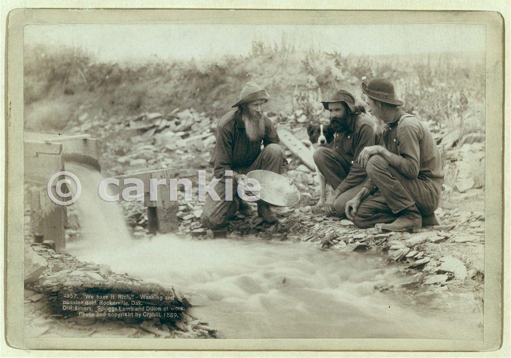 "We have it rich." Washing and panning gold, Rockerville, Dak. Old timers, Spriggs, Lamb and Dillon at work 1889. All photos of S.D mines and area are from the John C.H. Grabill collection LoC.